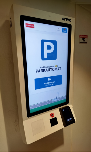 Bargeldlose Bezahlung am Kassenautomaten (EC- und Kreditkarte). Alternativ zahlen per Arivo-Pay, Arivo-App oder EasyPark-App